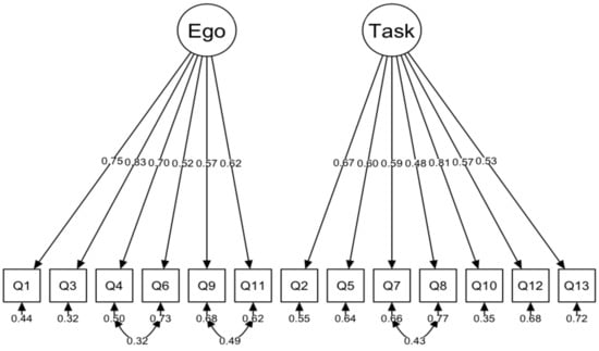 In reference to the two orientations, the task and ego orientation in sport questionnaire (TEOSQ) was created [,]. Currently, research on ego and task orientation in the field of sport activities is generally carried out using the task and ego orientation in sport questionnaire (TEOSQ) and perceptions of success in sport questionnaire (POSQ) []. They are among the most cited motivational methods in sport []. Adaptations of the TEOSQ both in the area of sport and/or physical education have been implemented in various countries, e.g., Spain, Italy, Greece, Portugal, Japan, Croatia, the UK, Korea. In the conducted studies, indicators concerning the reliability and validity of the tool were obtained. At first, two assumed factors (task and ego) were found in exploratory factor analysis []. Subsequent studies carried out in different countries in the area of sporting activity generally showed a satisfactory fit of the two-factor model to the data [,,,]. However, the basic two-factor model was not always fully fitted. For example, in one of the initial studies, TEOSQ models for different groups were improved by allowing error correlation for some test items []. Kim and Gill [] also improved the TOESQ model estimated on the sample of young Korean athletes by removing a few questions. The model estimated on the Mexican sample also did not achieve a good fit. It has been improved by allowing correlation for some errors of items [].