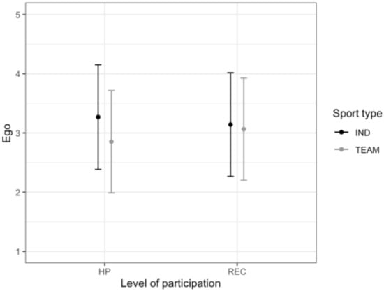 A statistically significant main effect of the sport type was noted for ego subscale (F (1.643) = 14.02, p < 0.001, ηp2 = 0.021). Individual athletes (IND) (M = 3.22, SD = 0.88) had higher scores on the ego factor than the team athletes (TEAM) (M = 2.98, SD = 0.87). There was also a statistically significant interaction effect of sport type and level of participation (F (1.643) = 7.51, p < 0.01, ηp2 = 0.012) (Figure 6). Among high performance, individual athletes (M = 3.27, SD = 0.88) had higher scores on the ego factor than the team athletes (M = 2.85, SD = 0.86) (p < 0.001). There were no statistically significant differences among recreational athletes (IND: M = 3.14, SD = 0.88; TEAM: M = 3.06, SD = 0.86; p > 0.05) (Figure 6). The main effects of the level of participation (F (1.643) = 0.61, p > 0.05, Gender (F (1.643) = 0.16, p > 0.05, and interaction effects sport type*gender (F (1.643) = 3.74, p > 0.05), level of participation*gender (F (1.643)1.83, p > 0.05) and sport type*level of participation*gender (F (1.643) = 0.67, p > 0.05) were not significant.