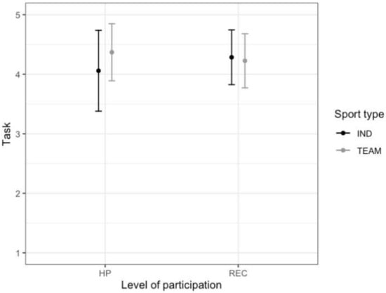 In the case of the task subscale, the main effect of the sport type was obtained (F (1.643) = 7.58, p < 0.01, ηp2 = 0.012). Team athletes (M = 4.28, SD = 0.47) had higher scores on the task factor than individual athletes (M = 4.14, SD = 0.62). The effect of interaction between level of participation and sport type was also noted (F (1.643) = 14.82, p < 0.001, ηp2 = 0.023) (Figure 7). Among high-performance athletes, team athletes had higher scores on the task factor than individual athletes (TEAM: M = 4.37, SD = 0.48, IND: M = 4.06, SD = 0.68; p < 0.001). There were no significant differences in task orientation among recreational athletes (TEAM: M = 4.23, SD = 0.45, IND: M = 4.28, SD = 0.46; p > 0.05). Moreover, among individual athletes, recreational athletes presented higher level of task orientation than high-performance athletes (p < 0.01) (Figure 7). However, no statistically significant main effects were observed for gender: F (1.643) = 0.91, p > 0.05, level of participation: F (1.643) = 0.64, p > 0.05, and interaction effects: sport type * gender: F (1.643) = 0.03, p > 0.05, level of participation * gender: F (1.643) = 0.60, p > 0.05, sport type * level of participation* gender: F (1.643) = 0.57, p > 0.05.