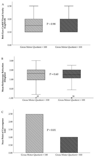 | Visual Development Parameter | Gross Motor Quotient < 100 (n = 80) | Gross Motor Quotient > 100 (n = 36) | p Value * |
