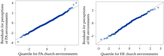 Table 3 displays adjusted associations between the physical church environment related to PA and HE and the three main study outcomes. For the first objective, multi-level analyses were used to control for non-independence within individual churches, since 53.2% (interclass correlation coefficient (ICC) = 0.53) of the variance in the perceptions of PA supports and 48.9% (interclass correlation coefficient (ICC) = 0.49) of the variance in the perceptions of HE supports were explained by church level effects. Results showed that physical church PA and HE environments were associated with higher scores on perceptions of the church environment for PA (B = 0.03, 95% CI = 0.01, 0.05) and HE (B = 0.06, 95% CI = 0.02, 0.09), respectively. For every one unit increase in church environment audit score, perceptions of church environment for PA increased by 0.03 and perceptions of church environment for HE increased by 0.06. Figure 1 provides residual scatter plots for these significant relationships. For the second objective, multi-level analyses were not used to control for non-independence within individual churches, since only 0.7% (ICC = 0.01) of the variance in self-efficacy for PA and 2.4% (ICC = 0.24) of the variance in self-efficacy for HE were explained by church-level effects. Results showed no significant associations between the physical church environment and self-efficacy for PA (B = 0.01, 95% CI = −0.01, 0.03) or HE (B = 0.00, 95% CI = −0.05, 0.05). Finally, multi-level analyses were not used to control for non-independence within individual churches for the third objective, since only 3.1% (ICC = 0.03) of the variance in meeting PA guidelines and 1.0% (ICC = 0.01) of the variance in meeting fruit and vegetable guidelines were explained by church-level effects. Results showed participants with higher physical church environment scores were not significantly more likely to meet PA guidelines (odds ratio (OR) = 1.00, 95% CI = 0.98, 1.03) or fruit and vegetable guidelines (OR = 1.02, 95% CI = 0.96, 1.09).