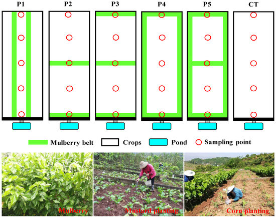 The experiment was conducted at the TGRA AGNSP monitoring station in Fuling district, Chongqing municipality (Figure 1). Eighteen test plots (width × length = 5.0 × 10.0 m) were used for observations of soil, runoff, and sediment. According to the main mulberry hedgerow planting patterns currently used in the TGRA, five crop-mulberry configuration patterns—namely, pattern 1 (two longitudinal mulberry hedgerows; P1), pattern 2 (two mulberry contour hedgerows; P2), pattern 3 (three mulberry contour hedgerows; P3), pattern 4 (mulberry hedgerow border; P4), pattern 5 (mulberry hedgerow border and one mulberry contour hedgerow; P5), and a control (no mulberry hedgerows; CT) were established (Figure 2). Three replicates were designed for each treatment. The belt width of each mulberry hedgerow was 0.5 m. The planting mode was a mustard–corn rotation. The amount of fertilizer applied to each plot was consistent, and N, P, and K were applied at approximately 156.8, 89.9, and 152.7 kg ha−1, respectively, for mustard planting, and 143.9, 41.0, and 108.7 kg ha−1, respectively, for corn planting.