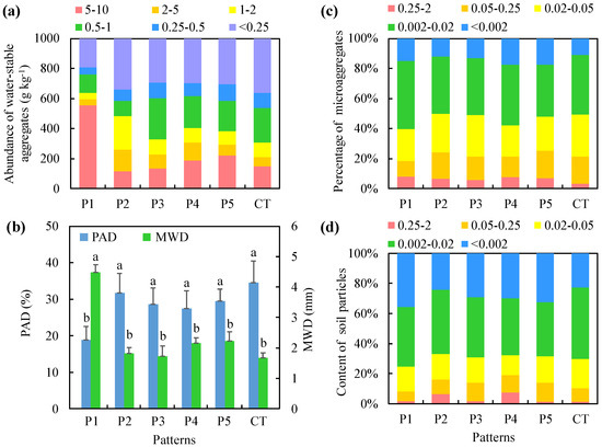 Different treatments had different influences on the soil aggregate structure in the crop-mulberry systems. The abundances of water-stable aggregates larger than 0.25 mm in P1–P5 were 1.26, 1.04, 1.11, 1.10, and 1.09 times that in CT, respectively. P1 had the greatest abundance of water-stable aggregates larger than 0.25 mm (806.33 g kg−1), and the water-stable aggregates larger than 0.5 mm accounted for 76.20% of the total water-stable aggregates in this treatment (Figure 3a). The PAD values in P1–P5 were 54.38%, 91.75%, 82.72%, 79.39%, and 85.11% of the PAD value in CT, respectively, with P1 exhibiting the smallest PAD (18.82%). At the same time, the MWD of water-stable aggregates was largest in P1 (4.48 mm) (Figure 3b).