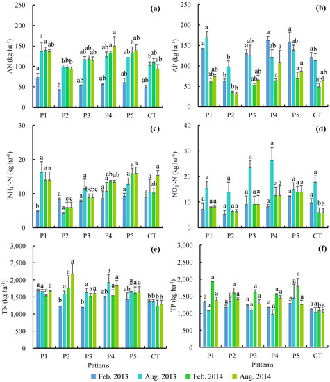 Soil buildup of available nitrogen (AN) (a), available phosphorous (AP) (b), NH4+–N (c), NO3−–N (d), total nitrogen (TN) (e), and total phosphorous (TP) (f) in the crop-mulberry systems on sloping farmland. The same letters above the bars indicate no significant difference and different letters indicate significant differences between these groups (p < 0.05).