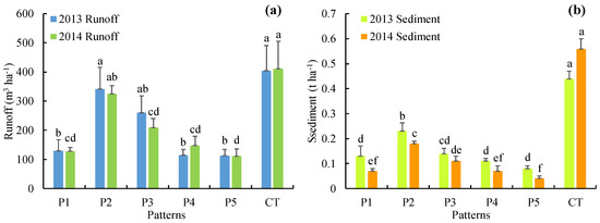 Runoff and sediment for different crop-mulberry planting patterns. The same letters above the bars indicate no significant difference and different letters indicate significant differences between these groups (p < 0.05).