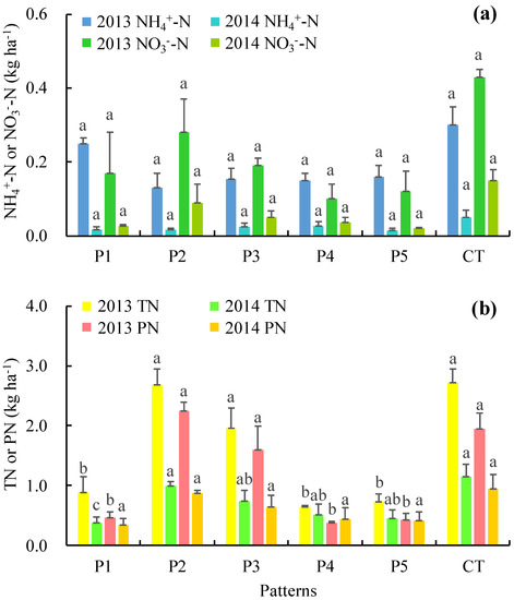 There were large differences in runoff N loss among the crop-mulberry planting patterns (Figure 6). Significance analysis revealed significant differences in the TN and PN losses in 2013 and TN loss in 2014, but there were no significant differences in NH4+–N or NO3−–N loss. The runoff TN losses in CT, P2, and P3 in 2013 were significantly greater than those in P1, P4, and P5, and the distribution of PN was similar to that of TN. The runoff TN losses in CT and P2 in 2014 were significantly greater than that in P1. The losses of NH4+–N in P1–P5 were between 0.02 and 0.25 kg ha−1, with an average value of 0.07–0.13 kg ha−1. Compared with the average loss of NH4+–N in CT (0.18 kg ha−1), the average losses of NH4+–N in P1–P5 were reduced by 23.7%, 58.3%, 49.1%, 49.4%, and 50.0%, respectively. The losses of NO3−–N in P1–P5 were between 0.02 and 0.28 kg ha−1, with an average value of 0.07–0.19 kg ha−1. Compared with the average loss of NO3−–N in CT (0.29 kg ha−1), the average losses of NO3−–N in P1–P5 were reduced by 66.2%, 36.2%, 58.6%, 76.6%, and 75.9%, respectively. The losses of PN in P1–P5 were between 0.34 and 2.25 kg ha−1, with an average value of 0.4–1.56 kg ha−1. Compared with the average loss of PN in CT (1.45 kg ha−1), the average losses of PN in P1–P5 were reduced by 72.5%, –7.7%, 22.6%, 71.7%, and 71.0%, respectively. The losses of TN in P1–P5 were between 0.38 and 2.72 kg ha−1, with an average value of 0.58–1.84 kg ha−1. Compared with the average loss of TN in CT (1.94 kg ha−1), the average losses of TN in P1–P5 were reduced by 67.2%, 5.2%, 30.4%, 70.2%, and 69.5%, respectively. Linear fitting revealed the linear relationships of NO3−–N, TN, and PN with runoff, with R2 values of 0.923, 0.965, and 0.906, respectively (Table 1). In general, the P4 and P5 treatments intercepted the most N in runoff.