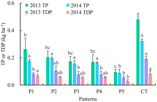 The five different crop-mulberry planting patterns intercepted varying degrees of P in runoff (Figure 7). Compared with those in 2013, the losses of TDP and TP in runoff in 2014 decreased by 41.5% and 20.1% on average, respectively. The runoff TP and TDP losses in CT and P1 were significantly higher than those in P5. The average losses of TP in P1–P5 were between 0.09 and 0.22 kg ha−1. Compared with the average loss of TP in CT (0.40 kg ha−1), the average losses of TP in P1–P5 were reduced by 45.6%, 50.3%, 59.1%, 58.8%, and 77.5%, respectively. The average losses of TDP in P1–P5 were between 0.04 and 0.08 kg ha−1. Compared with the average loss of TDP in CT (0.14 kg ha−1), the average losses of TDP in P1–P5 were reduced by 46.3%, 40.7%, 52.0%, 50.7%, and 70.4%, respectively. Therefore, P5 had the best interception effect on P loss via runoff.