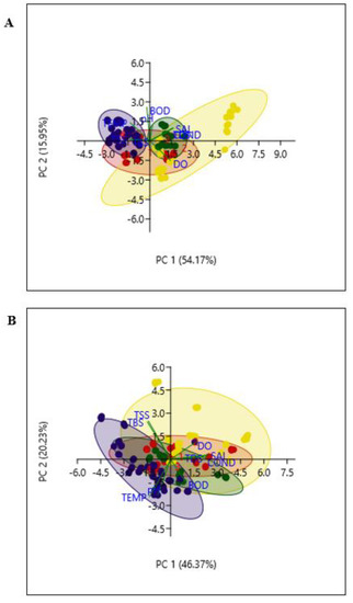 Based on the above view, the eigenvectors in the two PCs showed that temperature, TBS and TSS were strongly associated with the summer season in all the rivers. DO was partly connected with autumn, winter and spring in all the rivers (Figure 1; Table 2). Additionally, the multivariate association between the environmental variable and the seasons indicated that the EC, SAL and TDS were connected to autumn, winter and spring. The ellipsoidal system of 95% confidence level that clustered the variable in each season group helped to reliably visualize the multivariate distribution of the physicochemical parameters in the biplot. The marked differences in the Biplot and ellipses of the rivers showed that there were seasonal shifts in the physicochemical variables of the freshwater resources, depending on the river analyzed.