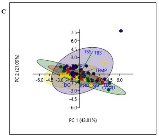Generally, factors having higher coefficients tend to influence the component and seasonal shifts in the physicochemical parameters of the three rivers (Table 2). Thus, EC, salinity and TDS had a substantial influence on PC1, while the second principal component (PC2) was influenced by temperature, TSS and TBS, with larger negative or positive loadings than PC1.