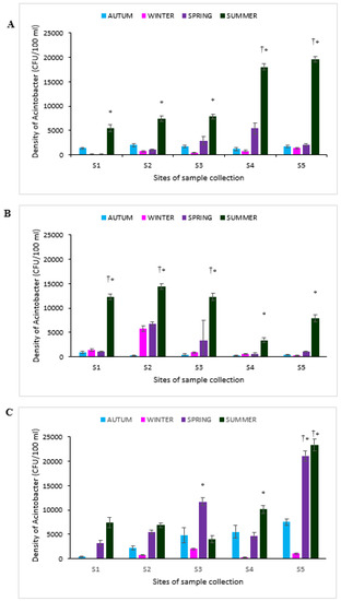 However, an average density (counts) of presumptive Acinetobacter species recovered during the autumn, winter, spring and summer was 1602 ± 257.38, 684.89 ± 114.91, 2312.67 ± 477.36 and 11655.33 ± 608.70 (CFU/100 mL) in the Great Fish River. Presumptive Acinetobacter species in Keiskamma were 460.97 ± 118, 1775.78 ± 223.15, 2577.67 ± 1006.99 and 10040.53 ± 598.48 (CFU/100 mL), while 4096 ± 805.45, 830 ± 111.14, 9216.67 ± 689.74 and 10331.07 ± 862.83 (CFU/100 mL) were recorded in Tyhume. In all the rivers, there was significant (p < 0.05) recovery of presumptive Acinetobacter species during the summer season compared to other seasons in this study. However, in the Tyhume River, the density of presumptive Acinetobacter species recovered during spring and summer seasons were significantly higher (p < 0.05) than autumn and winter (Figure 2C). Additionally, while presumptive Acinetobacter species recovered during the winter and autumn was significantly lower (p < 0.05) than the spring and summer seasons in the Great Fish river, recovery of the Acinetobacter species in the Keiskamma river during the summer seasons were significantly higher (p < 0.05) than other seasons. Nonetheless, a substantial number of Acinetobacter species were recovered at sampling point 2 (Keiskamma river) during the winter and spring compared to other sampling sites and autumn (Figure 2B).