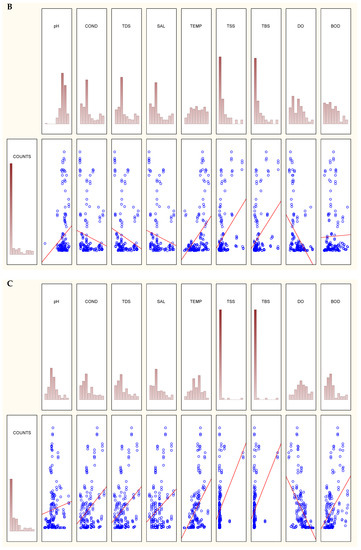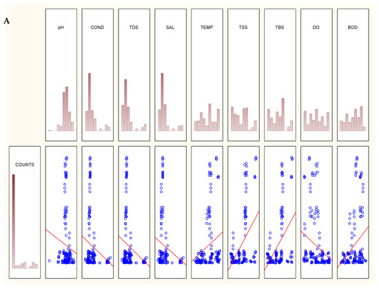 To further evaluate the effect of changes in the environmental variables on the density of Acinetobacter species in more details, we examined whether both the physicochemical variables and the density have any correlation using correlation test and topological graphs (Kohonen analysis). Table 3 presents the coefficient of correlation (r) and statistical significance (p-values) of the correlation test, while Figure 3A–C show the graphical representations of the relationship.