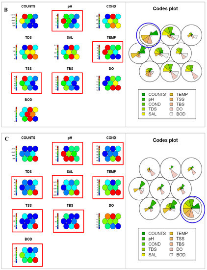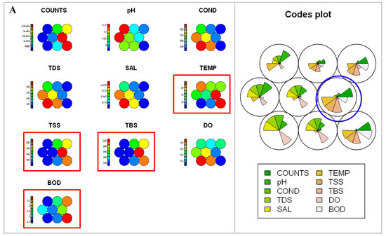 The relationships between physicochemical variables and seasons were assessed using PCA; while self-organized maps (SOMs) and Codes plots (Kohonen topological graphs) were advanced to measuring the effect of physicochemical variables and density of Acinetobacter species. The limitations of PCA have been observed when it comes to identifying the relationship between the density of bacteria and environmental factors [27,28]. However, to a certain extent, PC2 identified factors that significantly contributed to the density of Acinetobacter species in the rivers, while PC1 indicated factors that contributed less.