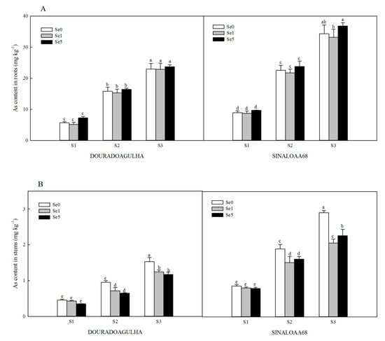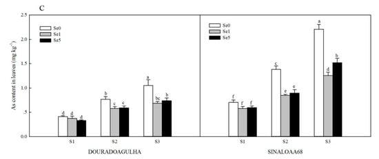 Figure 1. Effect of Se on As content in roots (A), stems (B), and leaves (C) of DOURADOAGULHA and SINALOAA68 grown on soils with different arsenic concentrations (S1 = 20.1 mg × kg−1, S2 = 65.2 mg × kg−1, S3 = 83.9 mg × kg−1). Different letters above the bars indicate significant difference between treatments at p ≤ 0.05.