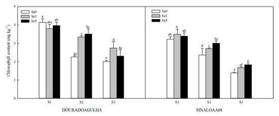 Figure 2. Effect of Se on chlorophyll content of DOURADOAGULHA and SINALOAA68 grown on soils with different arsenic concentrations (S1 = 20.1 mg × kg−1, S2 = 65.2 mg × kg−1, S3 = 83.9 mg × kg−1). Different letters above bars indicate significant difference between treatments at p ≤ 0.05.