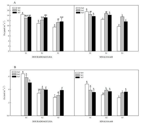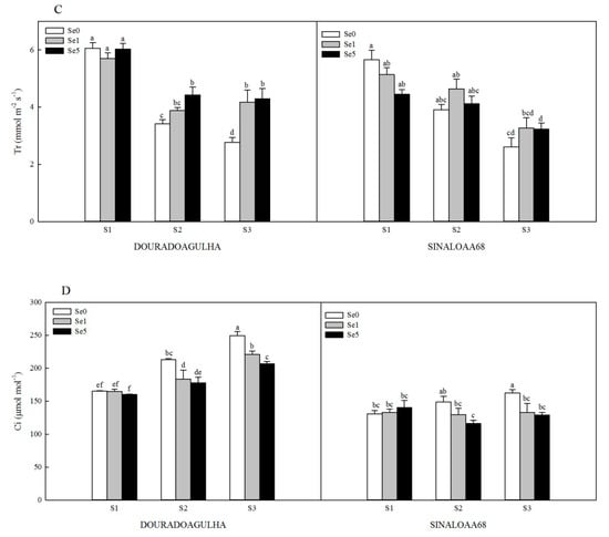 Figure 3. Effect of Se on net photosynthesis (Pn) (A), stomatal conductance (Gs) (B), transpiration rate (Tr) (C), and intercellular CO2 concentration (Ci) (D) of DOURADOAGULHA and SINALOAA68 grown on soils with different arsenic concentrations (S1 = 20.1 mg × kg−1, S2 = 65.2 mg × kg−1, S3 = 83.9 mg × kg−1). Different letters above bars indicate significant difference between treatments at p ≤ 0.05.