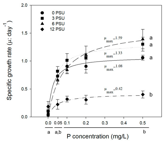 Variation in specific growth rate (μ) of Scenedesmus quadricauda with increasing P concentration at salinity levels of 0, 3, 6, and 12 psu. Experimental conditions are presented in Table 1 (Exp. 1). Data are presented as averages with standard deviations (bars). Lower case letters on the right side and bottom indicate significant differences (p < 0.05).