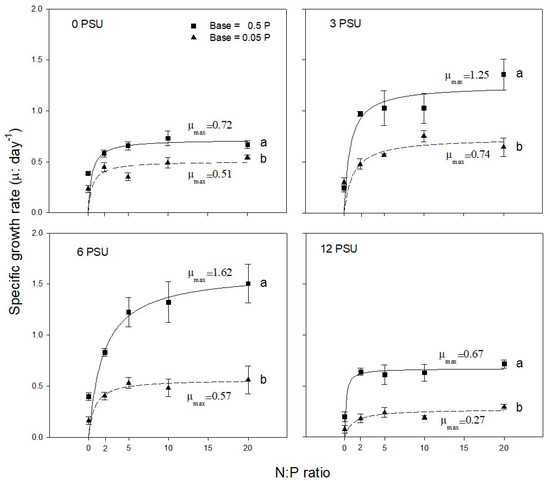 Variation in specific growth rate (μ) of S. quadricauda with increasing N:P ratio with two fixed P concentrations (0.05 and 0.5 mgP/L) at salinity levels of 0, 3, 6, and 12 psu. N concentration differs for the same N:P ratio because P concentration was fixed. Experimental conditions are presented in Table 1 (Exp. 2 and 3). Data are presented as averages with standard deviations (bars). Lower case letters on the right side indicate significant differences (p < 0.05).