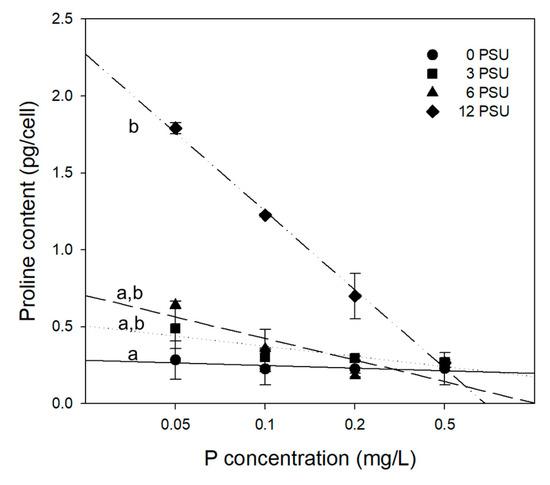 Variation in cellular proline content of S. quadricauda with increasing P concentrations at salinity levels of 0, 3, 6, and 12 psu. Experimental conditions are presented in Table 1 (Exp. 1). Data are presented as averages with standard deviations (bars). Lower case letters on the left side indicate significant differences (p < 0.05).