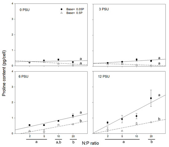 Variation in cellular proline content in S. quadricauda with increasing N:P ratio at fixed P concentrations (0.05 and 0.5 mgP/L) under salinity levels of 0, 3, 6, and 12 psu. N concentration differs for the same N:P ratio because P concentration was fixed. Experimental conditions are presented in Table 1 (Exp. 2 and 3). Data are presented as averages with standard deviations (bars). Lower case letters on the right side and bottom indicate significant differences (p < 0.05).