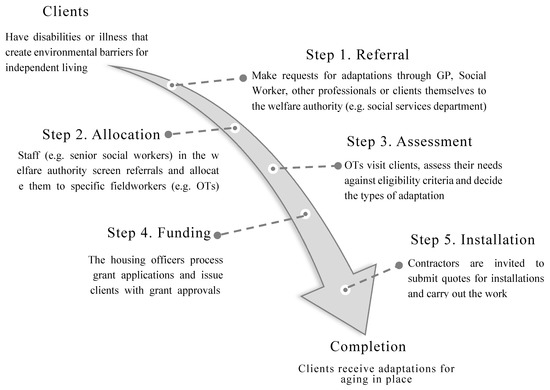 General ecological theories have offered a better understanding of the relationship between people and the environment. In practice, adapting the house to help older people remain independent could be beneficial to individuals, families and governments. A number of studies [35,36,37] have reported that housing adaptations have improved health, independence and quality of life in later life. Beyond health and independence, several other studies [38,39,40] have further found that environmental adaptations have reduced older people’s need for support from family caregivers and have lessened the strain on family relationships. Because of their key role in preventing falls, avoiding hospital admission and reducing domiciliary care, housing adaptations have brought significant savings to the National Health Service (NHS) services, home care costs and social services budgets [41,42,43]. In the UK, local governments have the statutory duty to fund housing adaptations for disabled people. There are differences in the types of financial assistance for adaptations in different housing tenures. Homeowners and private sector tenants apply for specific adaptation grants, e.g., disabled facilities grants (DFGs) in England and Wales and mandatory grants in Scotland, while social housing tenants use alternative funding from their landlords, e.g., housing revenue accounts and housing association funding. According to the Housing Grants, Construction and Regeneration Act 1996, DFGs are mandatory when adaptation work is necessary and appropriate to meet the needs of disabled people and when it is also reasonable and practicable considering the property’s age and condition. During the assessment process, the housing department should consult the social service department about the necessity and appropriateness of the adaptation. As a result, the adaptation process involves at least two local authority departments, with the social service carrying out assessments and the housing providing grants.