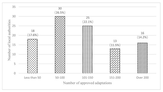 The survey found that the average number of adaptations completed by one local authority in 2014/15 was 154, with a wide range of 20 to 1545. As shown in Figure 4, only 14.2% of 102 local authorities completed more than 200 adaptations, while 71.6% carried out less than 150 adaptations, which was a relatively small number compared with the potential needs of an aging population. This was confirmed during interviews with a housing officer and an agency manager:
