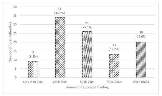 Also, there were significant variations in the amount of allocated funds per local authority, from £125k to £4500k, with an average of £777k. Figure 5 shows that 69 out of 102 local authorities spent less than £750k, which was not so different compared to previous years, as confirmed by a grant officer: