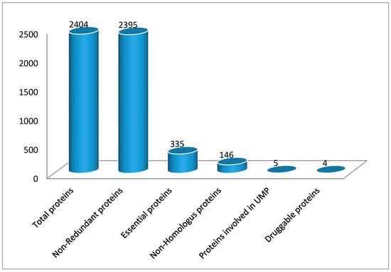 Proteins have an important role in various common cellular processes of bacteria and H. sapiens arose as homologs over the years. The proteins need to be critical for the pathogen’s survival within the body of the host but also non-homologous to host proteins for consideration as an effective drug target, and this condition is a requirement to avoid drug cross binding with the host proteins and the likelihood of the drug adverse events [26,27]. Therefore, BlastP was performed for all 335 essential proteins against H. sapiens. The results exhibited 146 non-homologous protein sequences having an identity of less than 30%. The best strategy for the generation of new drugs might be to develop and target inhibitors against these non-homologous sequences.