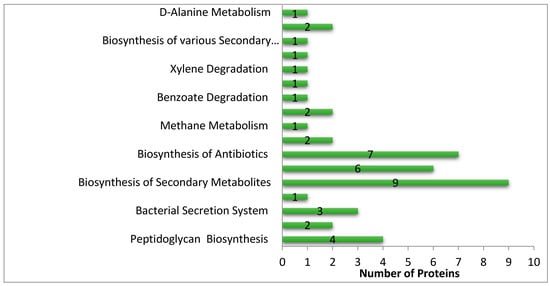 Peptidoglycan makes up the bacterial cell wall, and the inhibitors that inhibit peptidoglycan are grouped in one of the major antimicrobial classes. The drug targets exhibiting the potential of inhibiting the biosynthesis of peptidoglycan can also minimize the pathogenicity caused by a microbe [32]. Three proteins, i.e., D-alanine ligase, D-glutamate ligase, and UDP-N-acetylenolpyruvoylglucosamine reductase, were indicated to be potential targets against the pathogen.