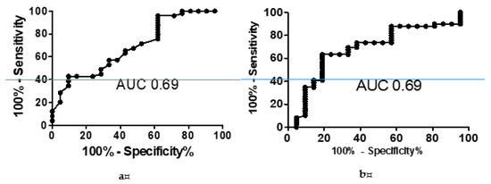 ROC (receiver operating characteristic) curve and AUC (area under the curve) value for ICT (inhibitory control test) in the diagnosis of MHE (minimal hepatic encephalopathy). (a) for the rate of incorrect responses, (b) for the lures/target accuracy rate.