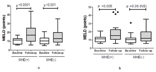 Comparison of baseline and follow-up MELD scores for end-stage liver disease in patients diagnosed with MHE based on psychometric hepatic encephalopathy score (PHES) (a) and ICT (b).