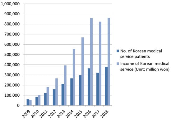 As a result of the government’s active support policies, Korea is becoming a major medical tourism country in Asia despite being a latecomer in the medical tourism industry. As shown in Figure 1, the number and income of patients using Korean medical tourism continued to increase until 2016, and the growth rate in 2017 decreased. Korean medical technology competitiveness ranks among the top OECD member countries. Health care costs are also one-third of those in the United States and two-thirds of those in Japan, with strong price competitiveness. In the early days of medical tourism, medical tourists visited Korea in the order of the US (23.0%), Japan (21.6%), and China (7.8%), but in 2018, the medical tourists were mainly from China (35.0%), the US (13.4%), and Japan (7.3%). In particular, the proportion of medical tourists from the US and Japan decreased, while that of China (35.0%), Russia (7.0%), and Kazakhstan (4.1%) increased [].