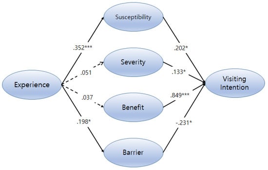 Hypothesis 1 proposed medical tourists with Disease Experience will have high health beliefs, which are Susceptibility (β = 0.352, p < 0.001) and Barrier (β = 0.198, p < 0.05) while Disease Experience was not significantly related in a positive way to their Severity (β = 0.352, p = 0.507) nor Benefit (β = 0.037, p = 0.621). Therefore, Hypotheses 1-2 and 1-3 were not supported by the path analysis. Hypothesis 2 proposed relationships between Health Beliefs and Visiting Intention. All Health Beliefs (Susceptibility, Severity, Benefit, and Barrier) had significant relationships with Visiting Intention. Benefit from Korean medical tourism had the most significant impact on Visiting Intention (β = 0.849, p < 0.001). Path analysis found that reversed Barrier scores had a negative impact on Visiting Intention (β = −0.231, p < 0.05). This result of analysis for Hypothesis 2-2 showed that foreigners who believe they have a low level of Barrier are willing to have a positive intention to be involved in Korean medical tourism. A summary of the outcomes for the hypotheses is presented in Table 5.
