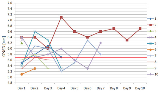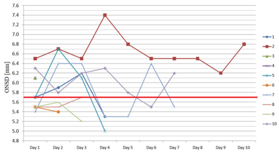 The consecutive measurements of the left eyeball ONSD during the study period (red transverse line shows the cut-off value).