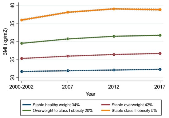 We calculated BMI from self-reported weight and height (BMI in kg/m2 units) in all survey phases. When naming the trajectory groups, we defined healthy weight as BMI 18.5–24.9, overweight as BMI 25.0–29.9, class I obesity as BMI 30.0–34.9, and class II obesity as BMI 35.0–39.9, according to the World Health Organization’s BMI classification [20].