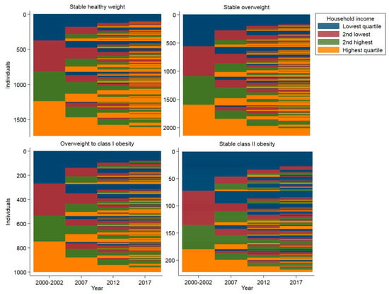Sequence index plots of household income by the body mass index (BMI) trajectory groups: individual-level sequences in household income quartiles visualized over the follow-up. The y-axis includes all the individual observations within a BMI trajectory group, and the x-axis demonstrates the follow-up time. Each participant’s household income level sequence has been drawn in a horizontal line.