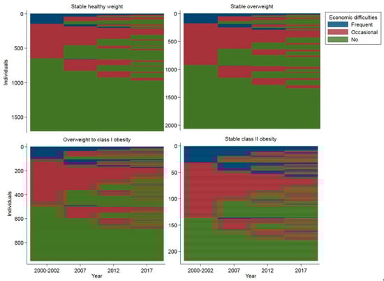 Characteristics of sequences in current economic difficulties by the body mass index (BMI) trajectory groups over the follow-up (2000–2017).