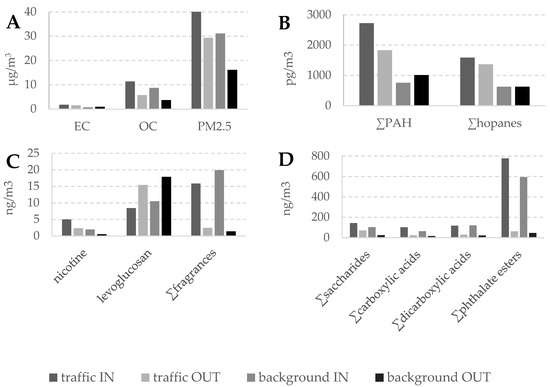 Mean concentrations of (A) elemental carbon (EC), organic carbon (OC), PM2.5, and the sum of organic molecular compounds (B): polycyclic aromatic hydrocarbon (PAH), hopanes, (C): nicotine, levoglucosan, fragrances, (D): saccharides, (di-)carboxylic acids, and phthalate esters) in the indoor and outdoor aerosols of the schools located near traffic and background sites.