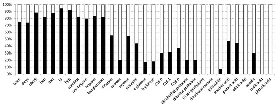 Relative component loadings (%) obtained from multivariate curve resolution-alternating least squares of the organic molecular tracer compounds in PM2.5 aerosols from the schools shown in Figure 1 that represent the indoor (white bars) and outdoor (black bars) organic aerosol (OA). The abbreviations in the abscissas axis are indicated in Table 1.