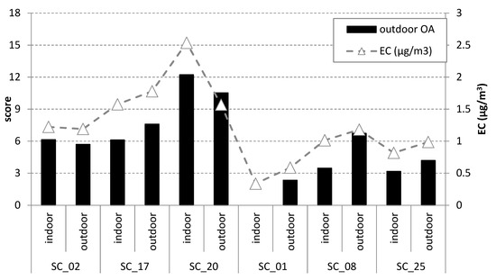 Score values of the outdoor organic aerosol component obtained by positive matrix factorization of the concentrations of the organic molecular tracers of the selected schools (left y-axis). The average EC concentration in the schools (right y-axis; µg/m3) is also displayed. The locations of the stations are shown in Figure 1.