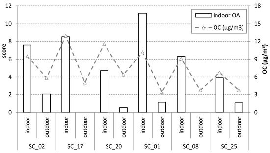 Scores values of the two components, interpreted as outdoor and indoor organic aerosol (left y-axis), obtained by positive matrix factorization of the concentrations of organic molecular tracers of the selected schools. The average OC concentration in the schools (right y-axis, µg/m3) is also displayed. The locations of the stations are shown in Figure 1.