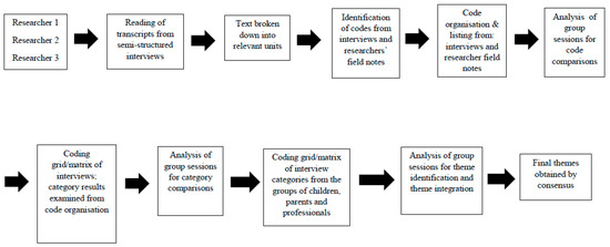 A thematic and inductive analysis was conducted [19,25] by three researchers (EMB, JGR, and JPC). This type of analysis is consistent with the design in covering the multiple perspectives of the case study participants [20]. Full verbatim transcripts were created for each of the semi-structured interviews, focus groups, informal interviews, and researchers’ field notes [19]. Thematic analysis [25,26] consisted of identifying the most descriptive content to obtain codes and then reduce and identify the most common categories. In this manner, clusters of codes (categories) were formed, i.e., similar points or content that allowed the emergence of themes describing the experience of the study participants [19]. To identify the relevant content, researchers read and reread the text, adding marginal notes and forming initial codes [22]. This method generates an increasing level of abstraction and complexity for the analysis from codes to categories and, finally, themes [19]. This process of coding was performed separately for the interviews and researcher field notes, as well as for the parent and health care professional groups. A coding grid or matrix was created with the codes and categories [27]. A matrix or coding grid is a format used to display qualitative data that systematically presents information so the user can draw conclusions and take needed action(s) [27]. Within this grid, we identified the narratives that justified the obtained results [27]. This process of thematic analysis was carried out separately on non-participant observations, informal interviews, focus groups, and semi-structured interviews. Subsequently, joint meetings were held to pool the results of the analysis. In addition, data collection and analysis procedures were discussed at these meetings. In the event of differences of opinion, the identification of the topic was made via consensus among the members of the research team. Finally, the research team held joint meetings to present, combine, integrate, and identify the final themes [20] (Figure 1). Notably, the final themes were decided by researcher consensus [17,19]. No data analysis software was used.