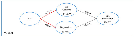 To test the hypotheses of the study, three models were designed. Before building Model 1, two partial models were designed to ensure that there was empirical support for some theoretical relationships. The simplest one included only the direct relationship of cybervictimization with life satisfaction, showing a significant regression coefficient of −0.31 (p < 0.01). Cybervictimization had a significant negative coefficient but a small R2 (0.10), providing a scant explanation of the influence that it could have on life satisfaction in the absence of other variables of emotional adjustment on which it also has a theoretical influence. The second exploratory model was developed to test a possible influential effect of depression on the relationship between cybervictimization and life satisfaction. The result revealed that, when introducing the depression construct, the relationship of cybervictimization with life satisfaction shifted to almost null (−0.08), while presenting a significant coefficient of 0.32 with depression (p < 0.01), and revealing a significant negative relationship of −0.70 between depression and life satisfaction (p < 0.01). The explained variance of life satisfaction also increased (R2 = 0.54).