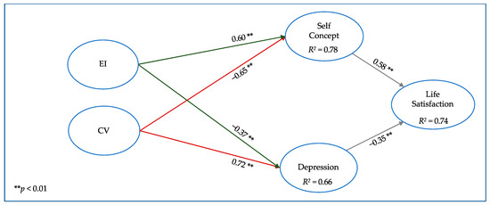 The first row in Table 2 indicates that Model 1 (Figure 1), which included cybervictimization and the constructs linked with emotional adjustment for this study, presents very good goodness-of-fit indices in general. This model is the basis for comparing the relationship of cybervictimization with emotional adjustment before and after considering IE. It confirmed the theoretical relationship of cybervictimization with the emotional factors, positively related to depression (0.88) and negatively to self-concept (−0.74). Moreover, as expected, the regression coefficient between self-concept and life satisfaction was positive (0.51), indicating that a high self-concept tended to be associated with high life satisfaction, whereas the relationship between depression and life satisfaction had a negative coefficient (−0.42).
