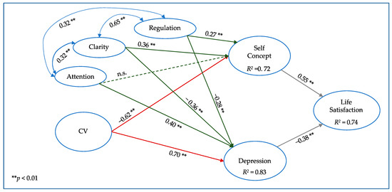 In Model 3 (Figure 3), emotional attention, emotional clarity, and emotion regulation were included as independent constructs. Clarity and regulation showed a high covariance with each other (0.65), whereas attention had a lower relationship with both of them (0.32). This model had similar goodness-of-fit indices to the previous models in Table 2 but revealed the smallest estimation errors, with the lowest RMSEA and SRMR indices. It also produced higher R2 coefficients in all the endogenous variables (self-concept, depression, and life satisfaction) compared with Model 1, thus indicating its explanatory superiority.