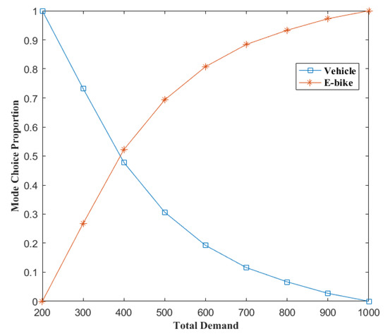 Figure 2 shows how mode choice proportions vary from the total demand. In this experiment, demands of OD pairs 1-5 and 2-5 are set to grow at the same rate. It can be seen from Figure 2 that proportion of vehicle demand decreases with increasing total demand, while the proportion of E-bike demand changes conversely. If the total demand is larger, the network tends to be more congested. As discussed before, E-bikes have higher flexibility than vehicles and can maintain higher speeds than vehicles in congested areas despite their lower maximum speeds. Hence, when the network is more congested, users of the network prefer to choose E-bikes rather than vehicles.