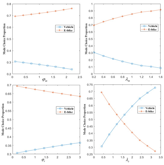 Figure 3 shows how proportions of vehicle and E-bike demand vary by changes in values of out-of-pocket-related parameters , , , and . As shown in Equation (8), and denote the monetary cost per unit of distance traveled by vehicles and E-bikes, respectively, and and denote the monetary cost per unit of time for vehicles and E-bikes, respectively. Figure 3 shows that the proportion of vehicle (E-bikes) demand decreases with the growth of the corresponding parameters and ( and ). As mentioned before, out-of-pocket cost is impacted by fuel or electricity consumption, vehicle or E-bike depreciation, insurance, the environment, and so on. For example, when the price of fuel increases (values of and increase in this case), users tend to reduce vehicle use. Similarly, when the weather conditions are poor (such as raining) or the road safety conditions for nonmotor vehicles are low (values of and increase in these cases), out-of-pocket costs related to E-bikes increase, thus the choice proportion of E-bikes becomes smaller.
