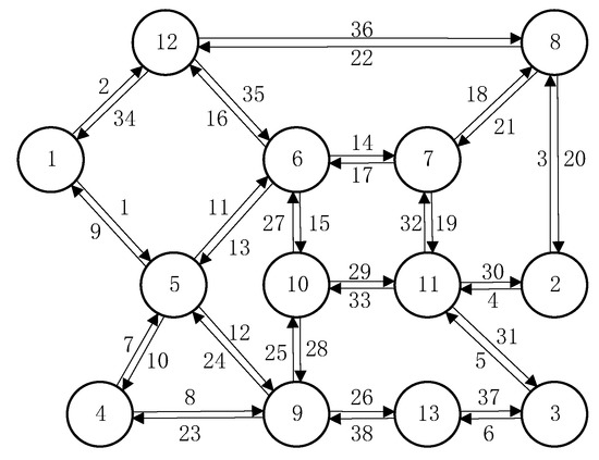The proposed model is further tested using the well-known Nguyen–Dupuis network shown in Figure 4. It consists of 13 nodes, 38 bidirectional links, and 18 OD pairs (all possible combinations between the three left nodes {12, 1, 4} and the three right nodes {8, 2, 3}). Fifty routes considered by Zhu et al. [42] are used. The length of each link is set to be , and other link characteristic parameters are shown in Table 6. Parameters in link time Functions (12) and (13) are set to be and for any link, and other parameters in link time Functions (10)–(13) and route cost Function (9) are set to be the same as those of the simple example. The travel demands of 18 OD pairs are shown in Table 7.