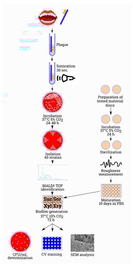 The ability to form biofilm by the tested isolates (biomass, number of colonies in the biofilm, biofilm formation analysis in a scanning electron microscope) on selected dental materials and under the influence of the sweeteners was assessed in accordance with the method described in our previous work []. Figure 1 illustrates the process of the experimental procedure.