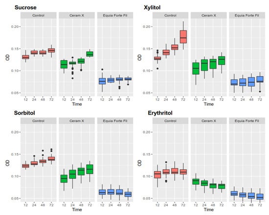 In the present study, the effect of 4 sweeteners used as food additives on biofilm formation on dental materials commonly used to fill defects in milk and permanent teeth was assessed. In the literature, xylitol, sorbitol, and erythritol have been described as non-cariogenic sweeteners, which have properties that inhibit the formation of cariogenic biofilms [,,]. Sucrose, in turn, is considered to be the most cariogenic of sugars used in food production.