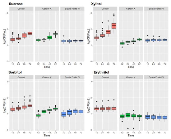 As with total biomass, the effect of erythritol caused the strongest effect of inhibiting the growth of live microorganisms (Figure 3). The growth of live microorganisms between 12 and 72 h for erythritol was equal to 0.03 log CFU/mL, while for sucrose this increase was equal to 0.32 log CFU/mL. Sorbitol was characterized by a weaker inhibitory effect (0.21 log CFU/mL increase) (Figure 3). Increased growth was observed for the medium enriched with xylitol (0.75 log CFU/mL).